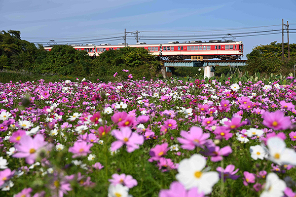 ●秋を探しにふらりと出かけたら、秋桜の絨毯の上を走る前パン車3両編成がぴたりと収まりました。