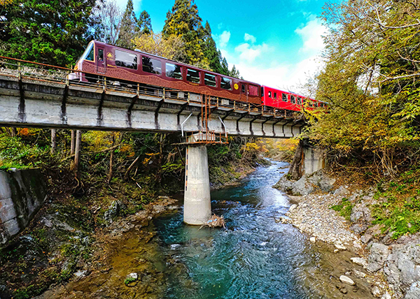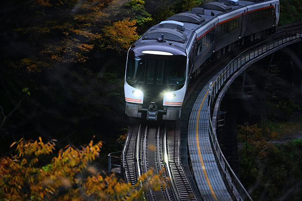 ●桜の葉が色づき始め、「もみじ」のヘッドマークを付けた特急列車が行き交う。