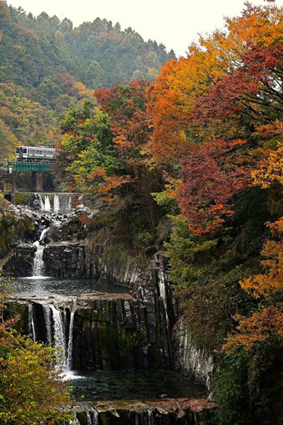 ●秋たけなわの田原の滝を渡る211系。しとしとと降る雨が、より一層、美しく紅葉した木々を引き立ててくれました。