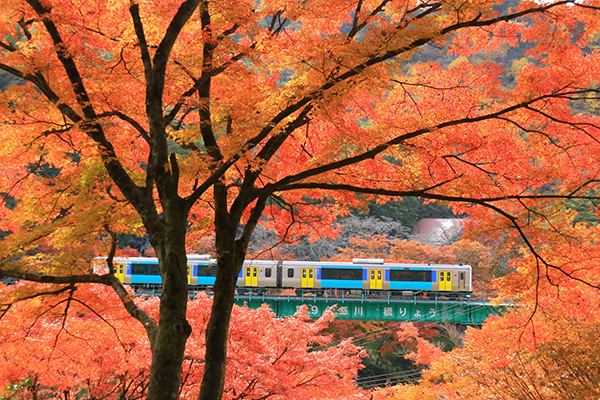 ●小雨降る中、紅葉の鉄橋を白煙をたなびかせて「SLパレオエクスプレス」が渡ります。