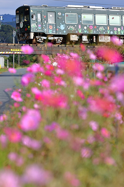 ●満開のコスモスの向こうに、ラッピング列車がやって来ました。