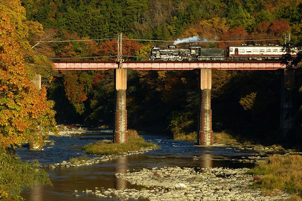 ●晩秋の西日を浴びて紅葉の荒川橋梁を渡ります。