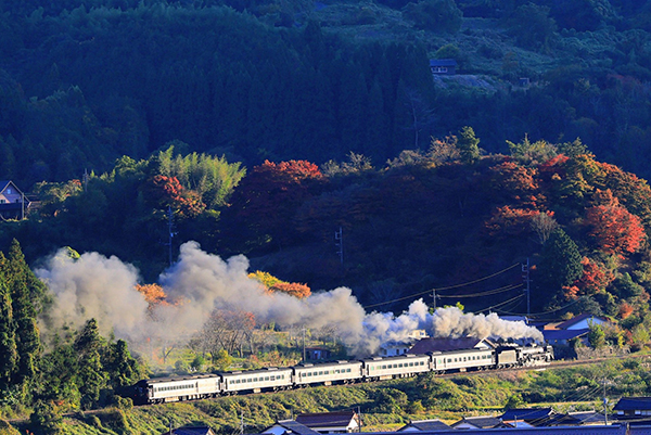 ●陽が西に傾き、「SLやまぐち号」に銀色の光が照らし別物に見えました。