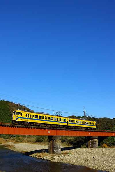 ●青い空を背景に、赤い鉄橋を渡る、黄色いフクチヤマイエローさん。穏やかなお天気の下でお逢い出来て、幸せな気分。