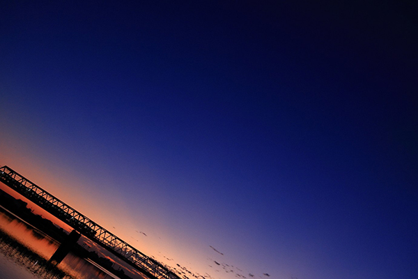 ●明るくなり始めた東の空をバックに、京王線の電車がトラス橋を渡ります。
