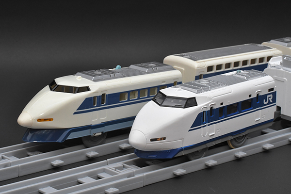 幼いころ親しんだ方も多いであろうプラレール旧製品の100系との並び。どちらにもアイテムとしての良さはあるが、こうして再びプラレールとして100系が復活するのは感慨深いものがある。