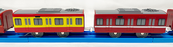 nayu1500_06 実車の2号車はパンタグラフを搭載しない車両だったが、プラレールではデフォルメの都合上搭載されている姿となる。 【この画像の記事に戻る】 1両ごとに色が違う「京急120年の歩み号」 実はここから始まったプラレールの京急1500形を見る! 前の画像 次の画像