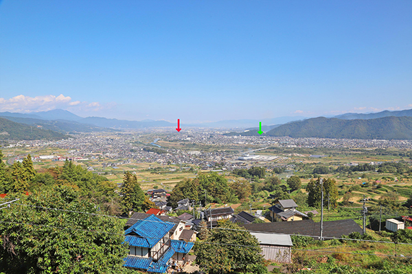 駅からの絶景「長野盆地」を眺めてみます。上写真の赤い矢印のあたりで千曲川を横切っているのが北陸新幹線の高架橋です。緑の印のあたりが、しなの鉄道の屋代駅付近。ちなみにしなの鉄道の屋代駅付近から姨捨付近を望むと、山の中腹からコンクリートの橋梁が見えるのですが、これが高速道路の長野道となります。その下に小さく見える架線柱の群れが見えるのですが、それこそがこの篠ノ井線姨捨駅付近になります。