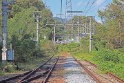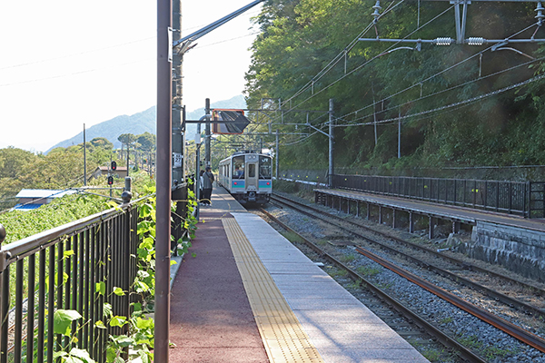 引上線から推進運転で姨捨駅に入る普通列車。テールライトは点灯しているが手前方向に進んでくる。