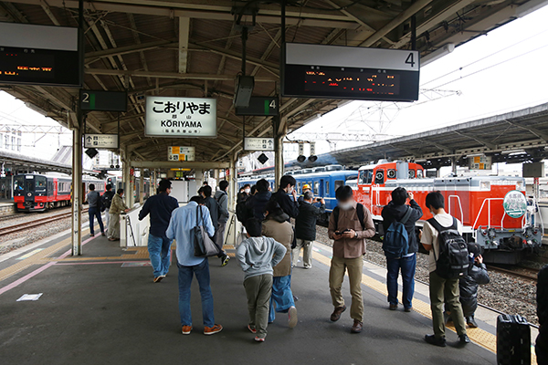磐城石川では長時間停車が設けられた。ホームはレイル・ファンで活気に満ちていた。