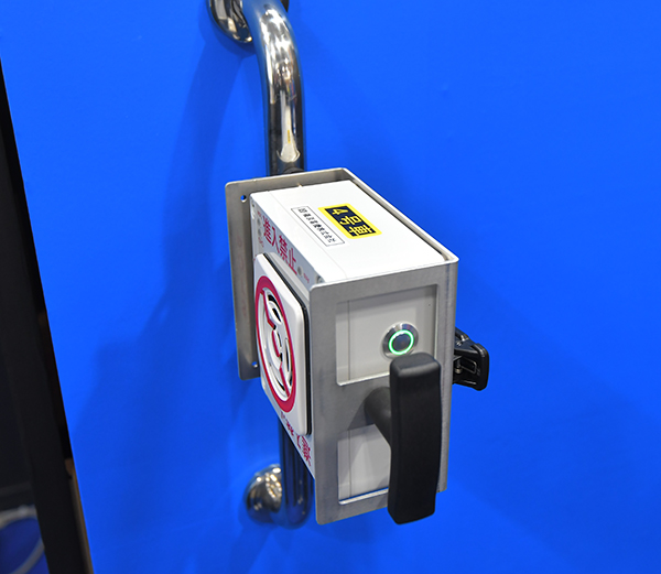 篠原電機で展示されていた清掃時の誤出発防止装置。現在中央線のグリーン車で実証実験を行っているよう。車内手スリにこの装置を取り付けることで車内側の装置と連動する。