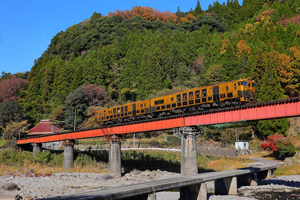 晩秋の紅葉を見ながら、「或る列車」が鉄橋を渡って走り去りました。