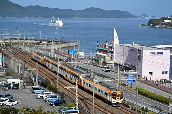 鳥羽港へ到着するフェリーと賢島を目指す「ビスタカー」の競演を見ることができました。