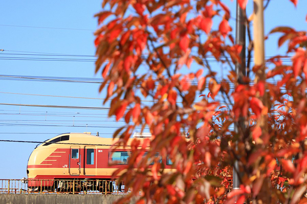のんびりした休日の朝。青空に紅葉した街路樹、特急「鎌倉」号の国鉄色が映えました。
