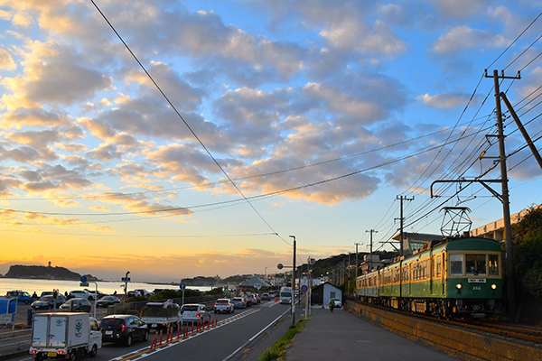 冬の夕陽が海辺を走る江ノ電の古豪を照らしました。