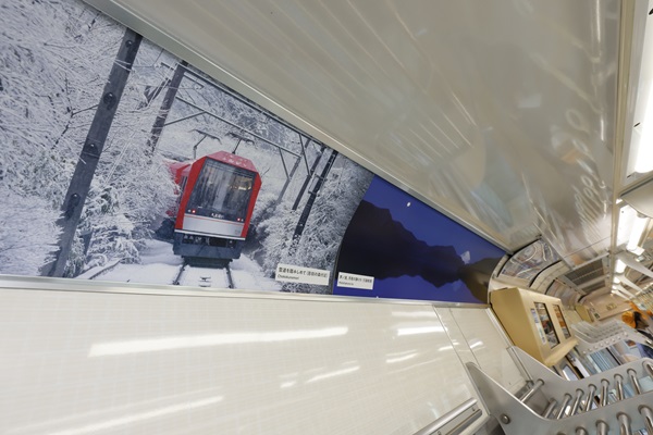 ▲車内の広告ポスタースペースに、箱根登山電車の名場面の写真が散りばめられています。