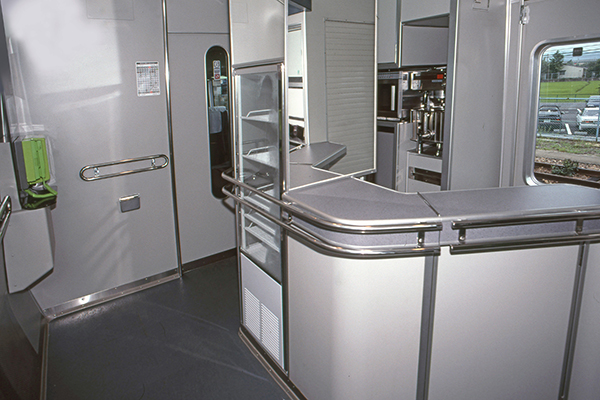 サハ680-201についていたプチ・カフェテリア。飲料水のほか軽食を扱う予定で、量産車にも設置されたが、2000年を境に営業を終了し後に車掌室に変更された。