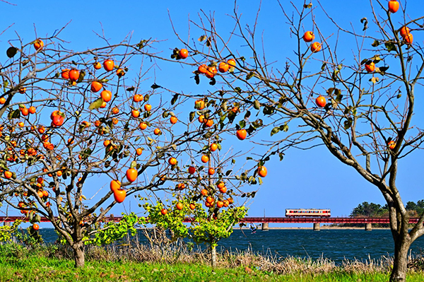 ●秋晴れの由良川橋りょうを見守る鈴なりの柿。今年は柿のなり年のようです。