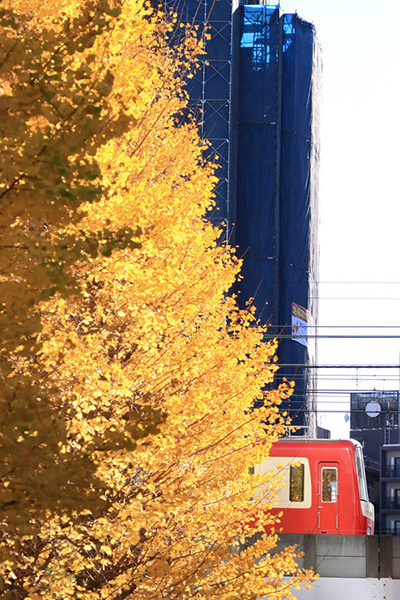 ●ビルとビルの合間に佇むイチョウの木。差し込む光に照らされた姿があまりにも美しく、思わず赤い京急と一緒に撮ってしまいました。