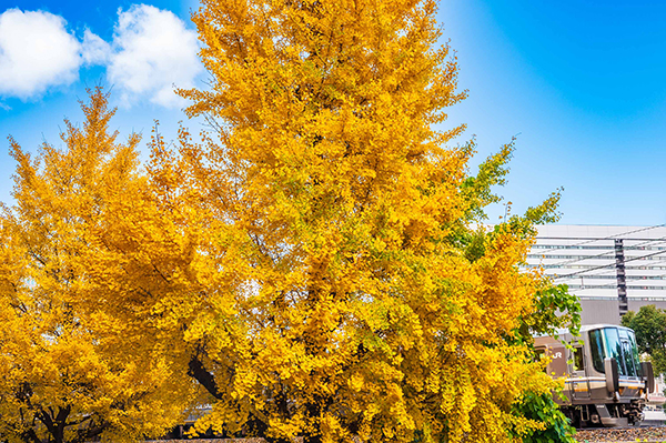 ●寒風に負けずに残ったイチョウの黄葉。そこから飛び出してきたのは、大阪駅に向かう223系回送列車。