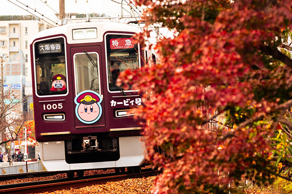 ●線路端に名残のカエデ。初冬の街を「カービィ号」が駆け抜ける。