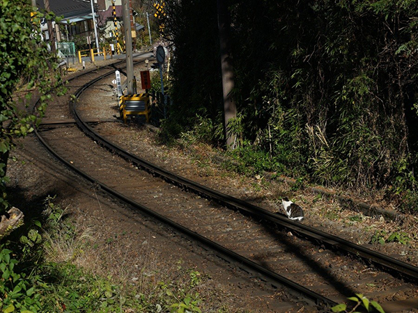 ●線路をゆっくり歩いたり、立ち止まってくつろいたり。線路のお散歩は猫にとって日常の様子でした。しばらくして猫は、線路脇のやぶの中へ消えていきました。