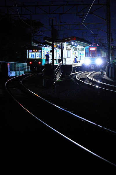 ●全線単線区間の江ノ島電鉄では重要な列車交換駅ですが、夜の風景のなか列車が並ぶシーンは旅情感がいっそう増してくれるよう…。
