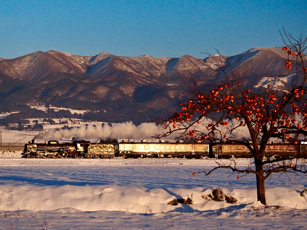 ●夕陽に照らされた「ばんえつ物語」、雪の中を新潟へ進みます。