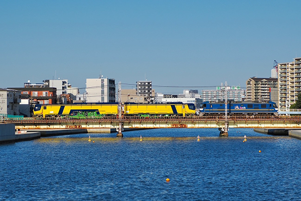 ●空、水面、機関車のブルーにイエローの車体が映えてました!