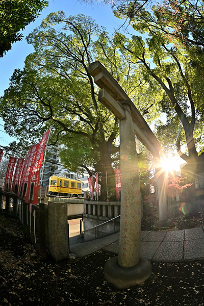 ●冬の夕日に照らされた神社の鳥居の横を事業用貨車デトが通り過ぎました。