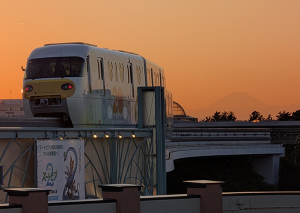 ●ディズニーリゾートで一日めいいっぱい楽しんで帰宅途中にディズニーリゾートラインがホームから見え、車掌さんが手を振ってましたので夕暮れの富士山バックに撮影しました。