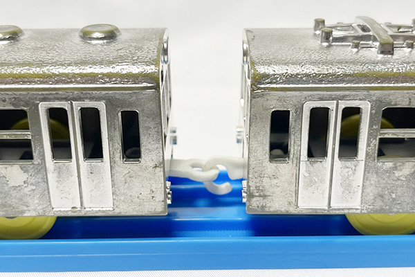 nayu10 この金型は乗務員扉の表現が省略されているため、見方によっては中間車同士の連結としても通用するデフォルメだ。 【この画像の記事に戻る】 その姿は「銀色の103系」のよう!?不思議な色のプラレール「ニューでんしゃ」とは一体何者なのか 前の画像