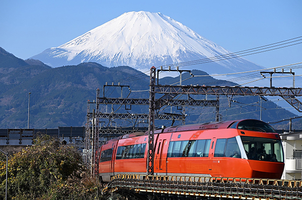 ●クリスマスイブイブの日、真っ白に雪化粧をした富士山にサンタクロースのような赤い衣装のロマンスカーがやってきました。