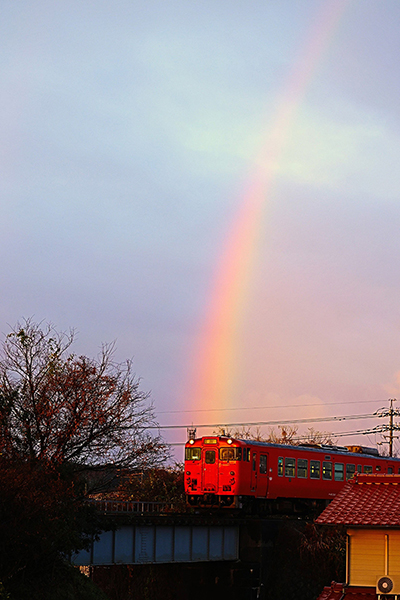 日の出を撮ろうと思っていましたら、振り向いたら虹がかかりました。周りは日が当たらなかったのですが、キハ40に見事にかかりました。