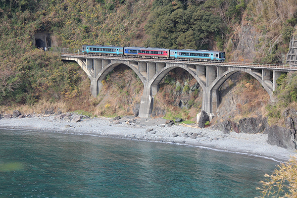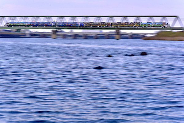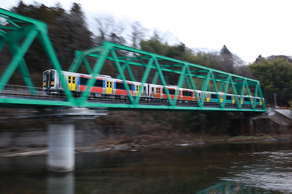 カラフルな編成がトラス鉄橋を駆け抜けます。