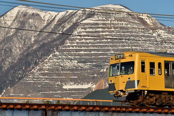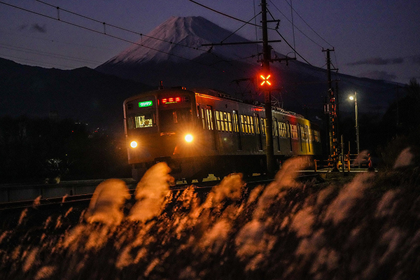 真冬の夕暮れ時に冠雪した富士山が綺麗に映えて、1300系「イエローパラダイストレイン」がやって来ました。ヘッドライトが冬風に靡くススキに反射して黄金色に輝いて見えました。