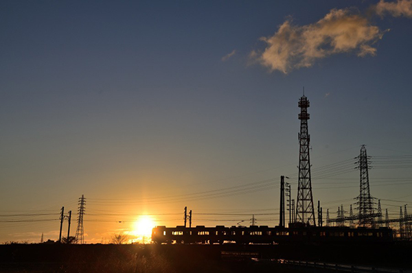 朝焼けの低い光線をベッタリと身に纏い、黄色い電車が行く。