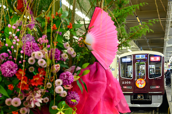 華やかなお正月仕様に模様替えした車止め花壇。そして、新型特急には「初詣」ヘッドマーク。