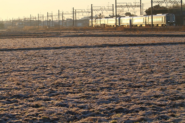 ●一面に霜が降りた朝、会津への特急が駆けて行きます。