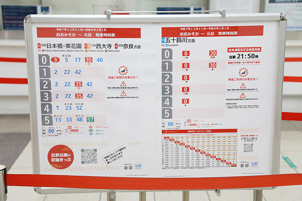 難波駅構内に掲示された終夜運転の時刻表。 近鉄奈良線 大阪難波(券売機コンコース)