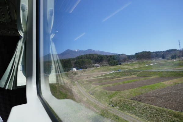 ▲下り進行方向右側、大カーブの内側の車窓。ちょうど曲線中点あたりだろうか。この先の進路の盛土が続いているのが見えるが、奥に行くにつれて田畑との高低差が縮んでいくのがわかる。おそらく春先頃の写真だが、遠くの八ヶ岳はわずかに雪を冠っている。