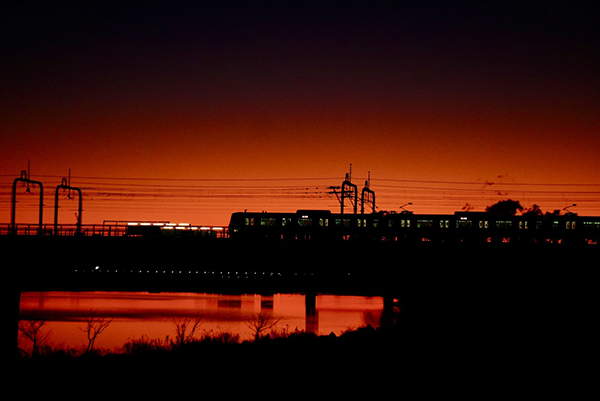 多摩川も真っ赤に染まった朝焼けの中、新宿に向かう早朝の列車を撮りました。