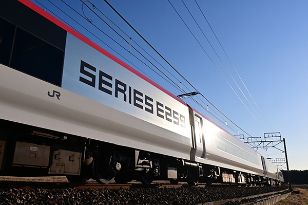 冬晴の中、真っ白な流線型の車体が一際映える。