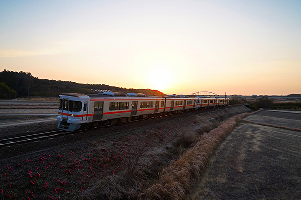 ●冬の朝、朝陽を浴びながら田園地帯を駆け抜け、亀山駅に向かう「キハ25形」4両編成。