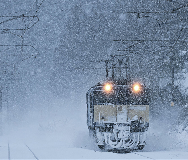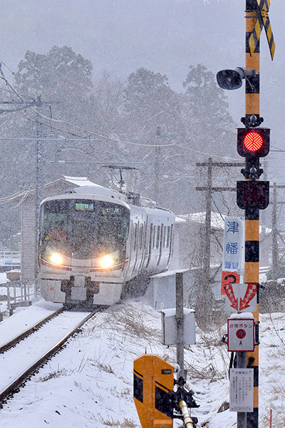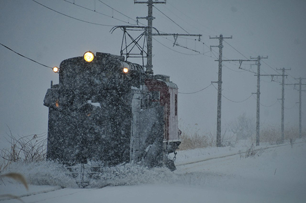 ●午後3時前とは思えない暗さの中、ラッセル車のヘッドライトが雪を切り裂いて駆け抜けていきました。