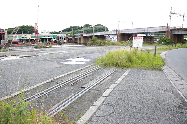 貨物駅の南端から延びていた漁港への引込線跡。奥の門は貨物駅のもの。