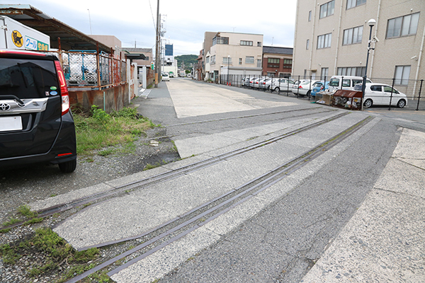 それでは、実際にその痕跡を見ていきたいと思います。現在駅近辺は駐車場やマンション等に変わっていますが、少し離れるとレールが残っていたりします。特に埠頭付近はレールがある箇所が多く、公道からも観察することができるためおすすめです。