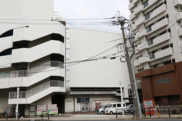 最後に、少しユニークな廃線跡をご紹介していきたいと思います。先ほどの貨物駅の北端から大通りを渡ると、駅前商業施設である「シーモール」の裏側に着きます。百貨店も入居する、駅前のランドマーク的な商業施設ですが、実はこの建物自体も廃線跡の一部なのです。シーモールの裏側の業務通路の一か所はかなり天井が広く造られています。実はこれこそが、シーモール建設前からあった引き込み線を跨ぐための空間の跡でした。なお、レールは1990年代ごろまでは残っていたそうです。