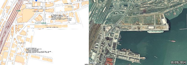 駅西側の埠頭の引き込み線と現在の地図。引用元:国土地理院撮影の空中写真(1975年撮影)と国土地理院発行地理院タイル(標準地図)