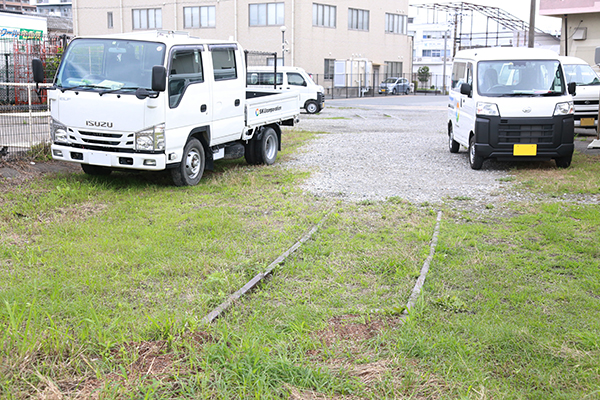 踏切跡から延びるレール。埋もれているが、しっかりとその姿をとどめている。